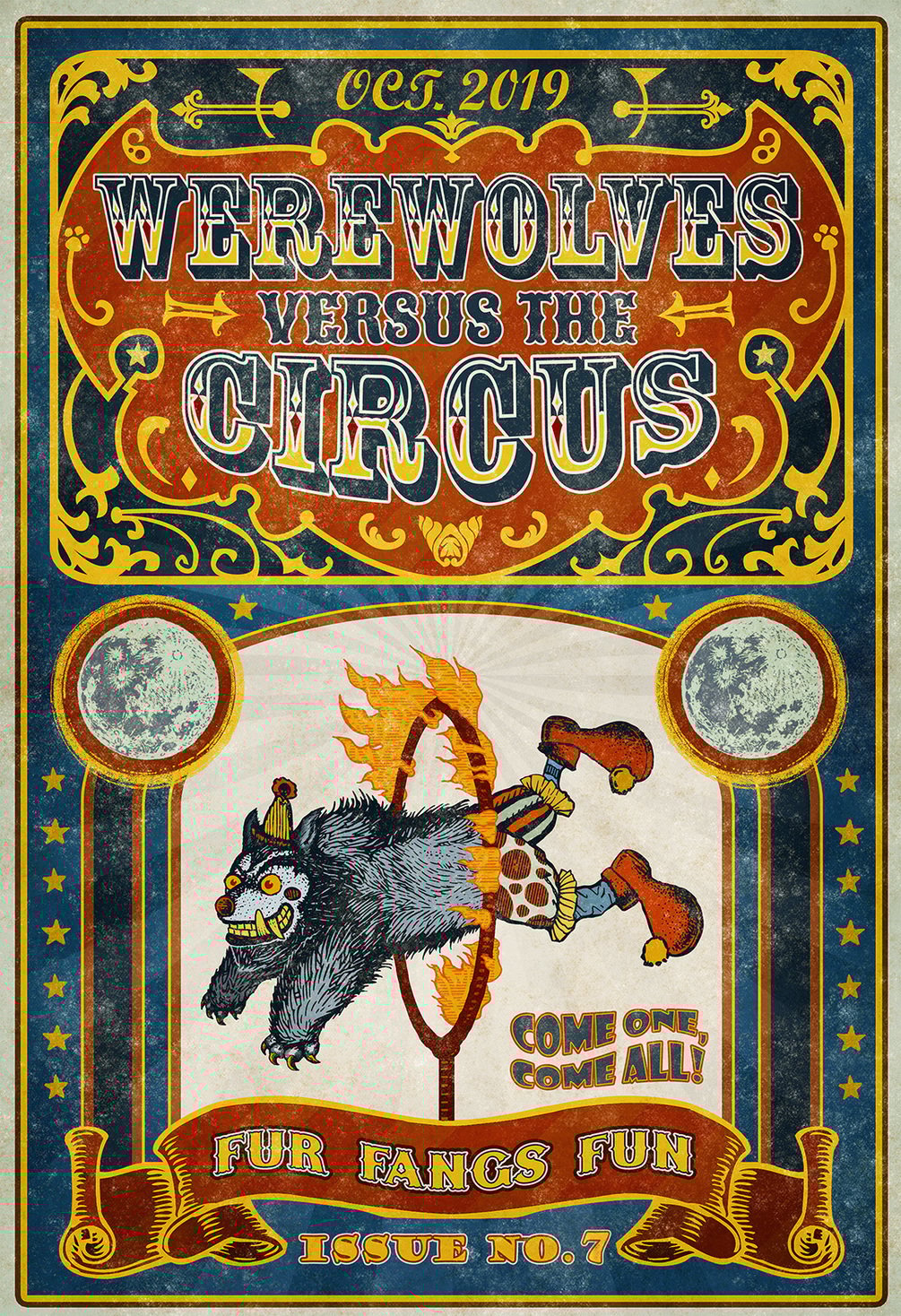 The mystery and danger of circuses and carnivals and travelling fairs tantalizes the wide-eyed child in us all. After all, anything could happen to you in the shadows between hastily-erected tents or in the big top's center ring. Stumble down the wrong sawdust-strewn path, and you might meet – or become – the creature of your nightmares. But don't worry! The clowns and carnies won't bother you as long as you're under the Ringmaster's yellow gaze. Stick around! The moon is rising, and the show is about to begin.